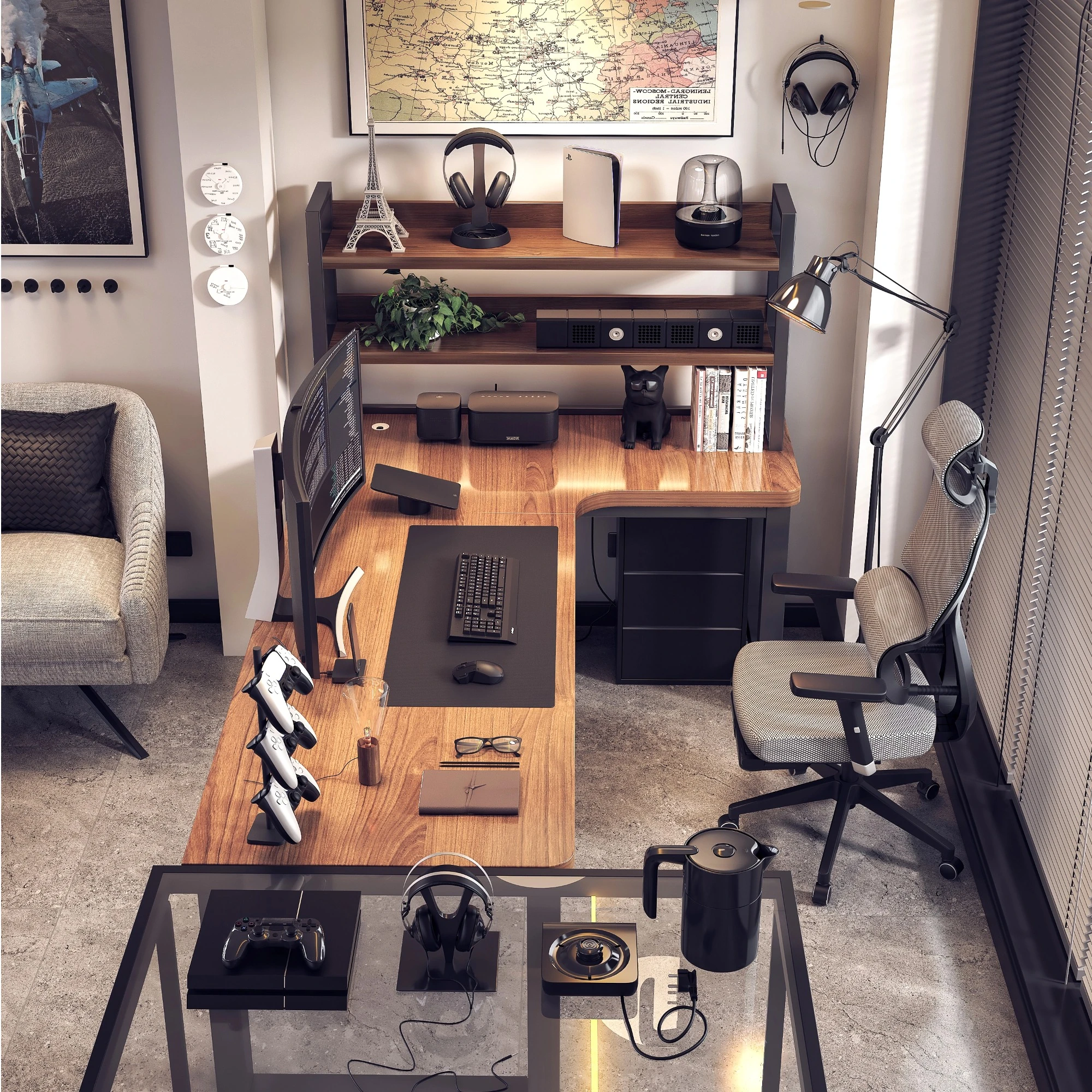 L-Shaped Computer Desk with Bookshelf – Stylish Corner Writing Table for Students and Home Office, Space-Saving Design for Bedroom and Workspaces